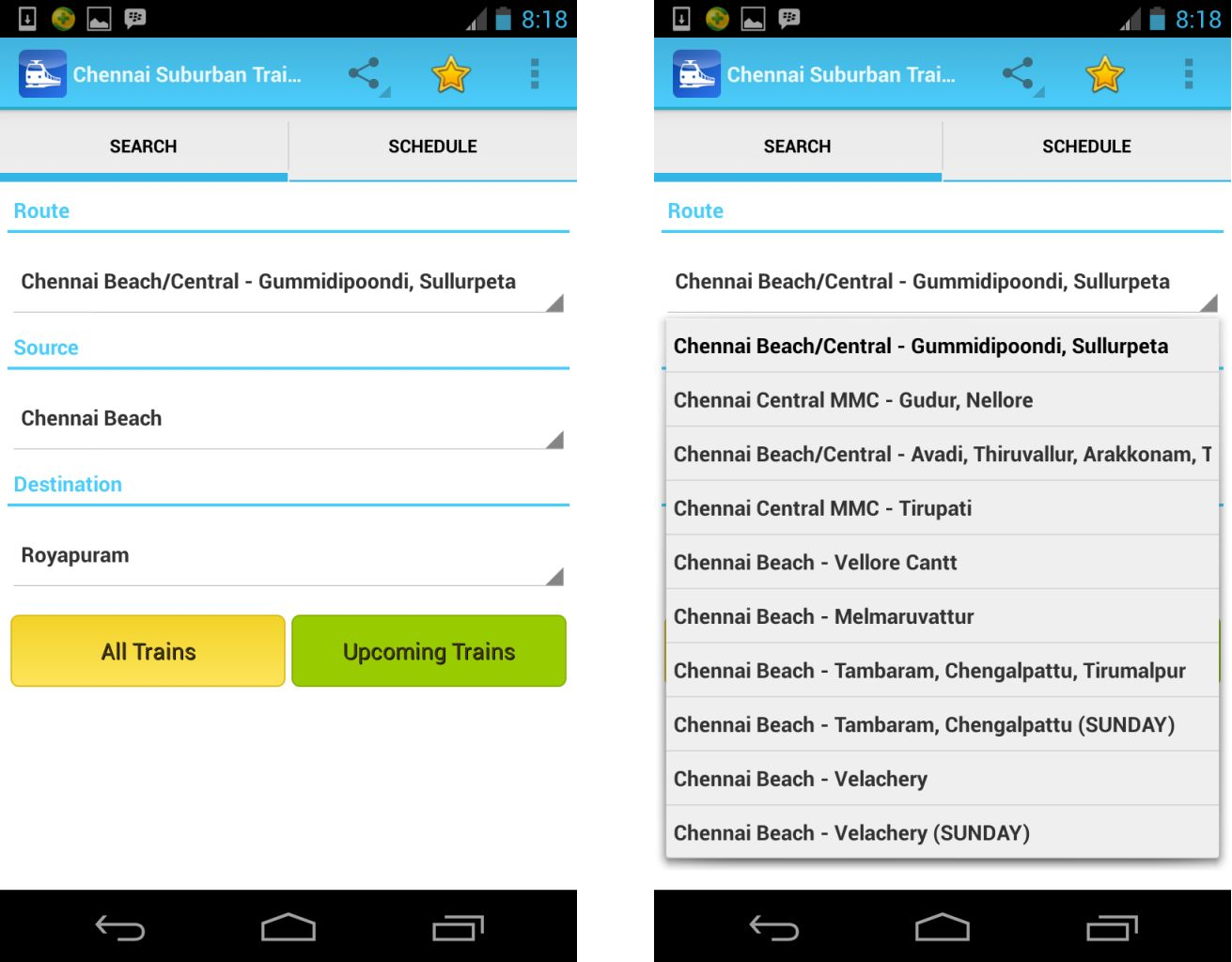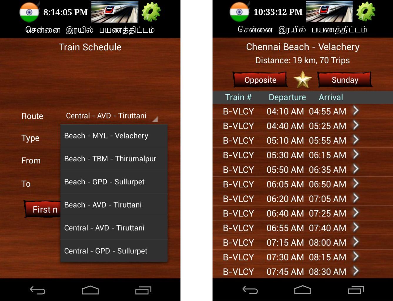 The Chennai Suburban Train Timings app works offline, which means you can view train information without internet connection. But, you need to ensure to keep the app up-to-date. Its interface is more user-friendly and displays more information than the previous app. It has two options – Search and Schedule. The Search option lets you search based on route, source, and destination. This app contains information of almost all the suburban and MRTS train routes.