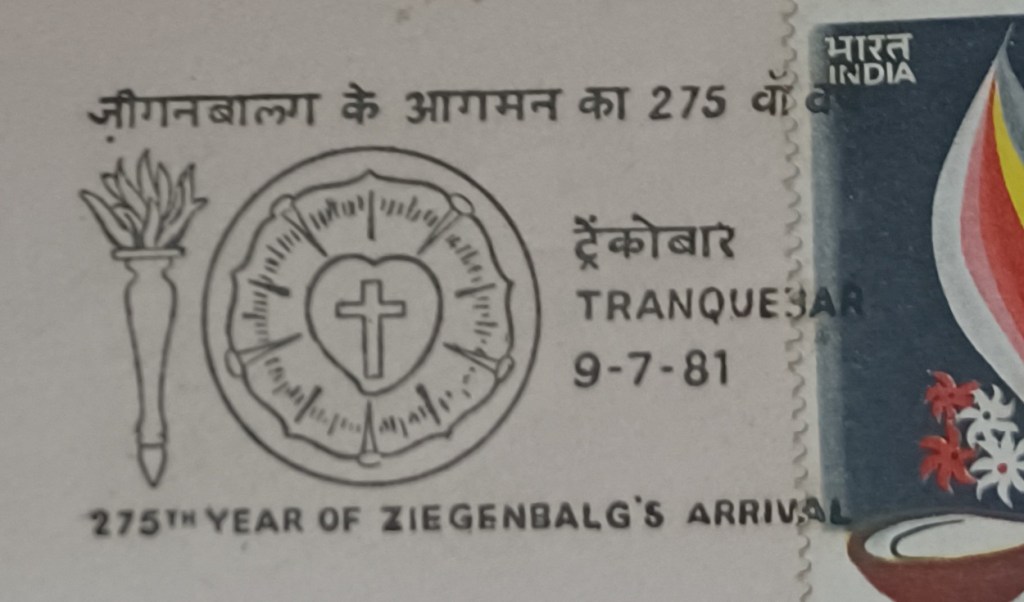 A special pictorial cancellation (postmark) was brought out on 9 Jul 1981 to commemorate the 275th anniversary of Ziegenbalg’s arrival at Tranquebar.