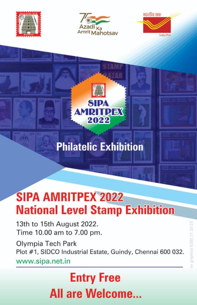As a proud member of South India Philatelists’ Association (SIPA), I am glad to invite you all to the national-level stamp exhibition, SIPA AMRITPEX 2022, to be held at Chennai from 13-15 August 2022.